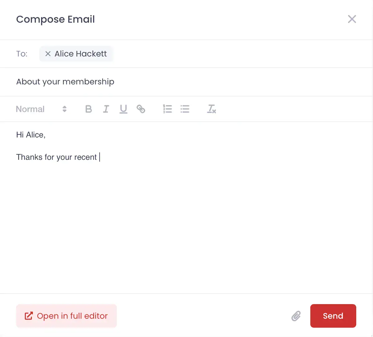 As you would expect, you can also send an email to a member directly from their Profile page. Simply click the Send Email button to launch the quick editor.