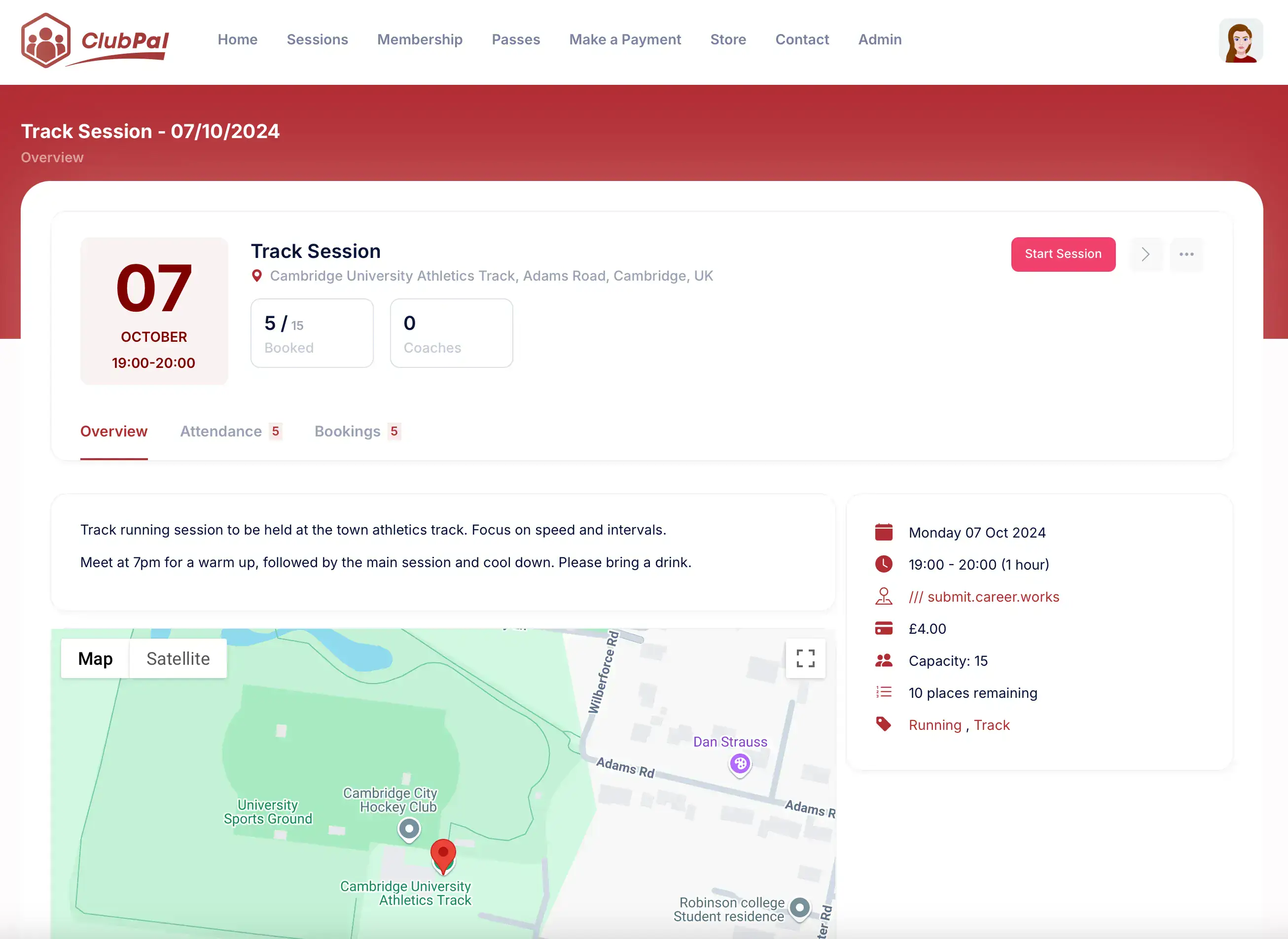 We've restructured the Session page, moving to a tabbed interface. This move gives us more space to add more features to sessions. We've moved the Attendance and Bookings to their own tabs, as well as adding Google Maps support and What3Words.