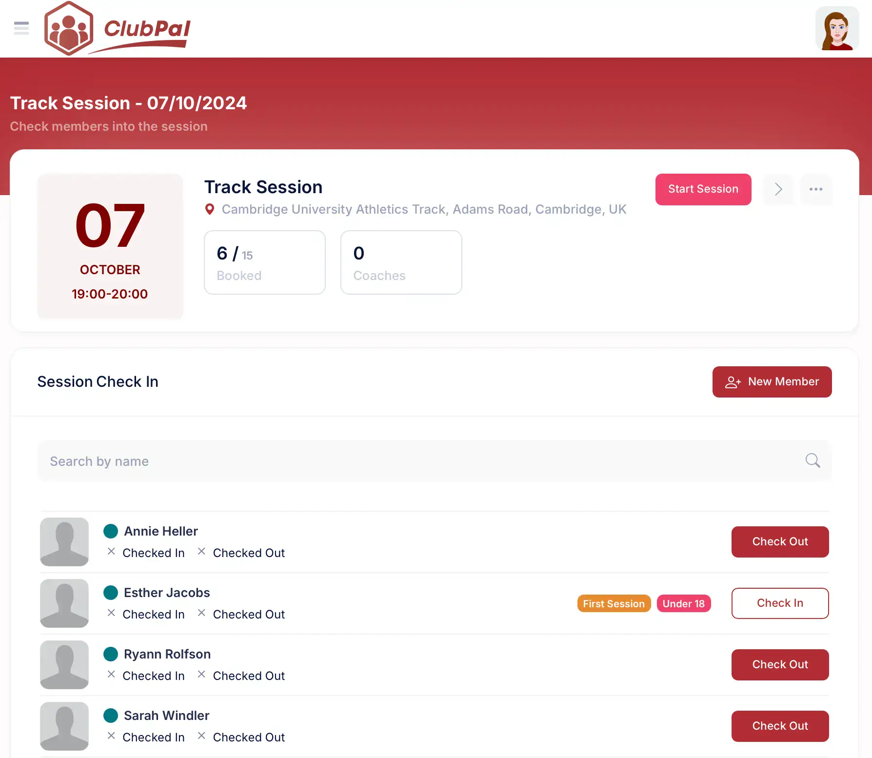 We've added two new flags to the session check in page. Members under 18 will have a badge added next to their booking to alert the coach. In addition, we've added a "First Session" badge to a members booking so the coach in charge of the session can welcome and brief the member.
